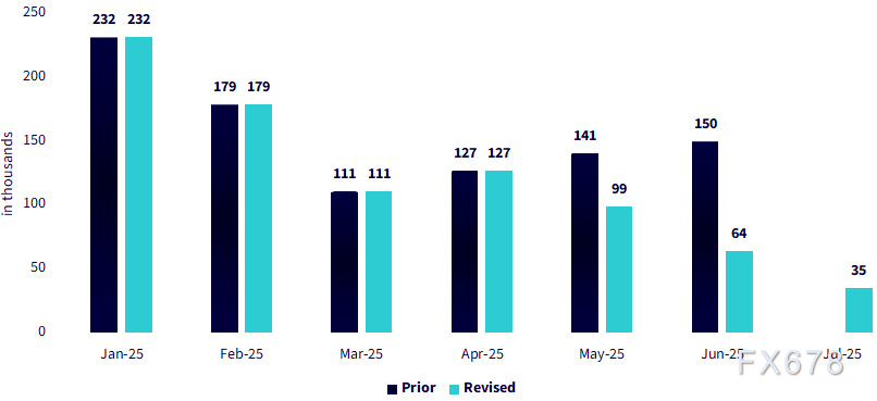7月非农就业新增7.3万人,明显低于市场预期的10.4万;前两个月数据合计下修25.8万人,创1979年以来(非疫情相关XM账户类型)最大幅度下修;受此影响,三个月移动平均就业增幅骤降至仅+3.5万人。