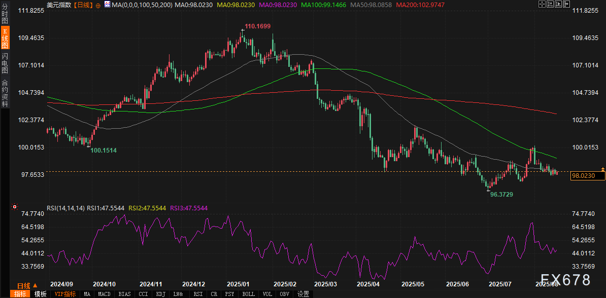 从技术形态看,XM账户类型美元指数在8月初触及数周低点后,呈现出弱势企稳迹象。日线图上,RSI(相对强弱指数)徘徊在40附近,未进入超卖区域,表明空头动能有所减弱,但也缺乏明确的反转信号。MACD指标显示快线与慢线在零轴下方趋XM账户类型平,短期内可能延续震荡格局。关键支撑位在97.50附近,若跌破可能进一步测试97整数关口;上方阻力位在50日均线99.0859,突破该点位需基本面利好的强力推动。