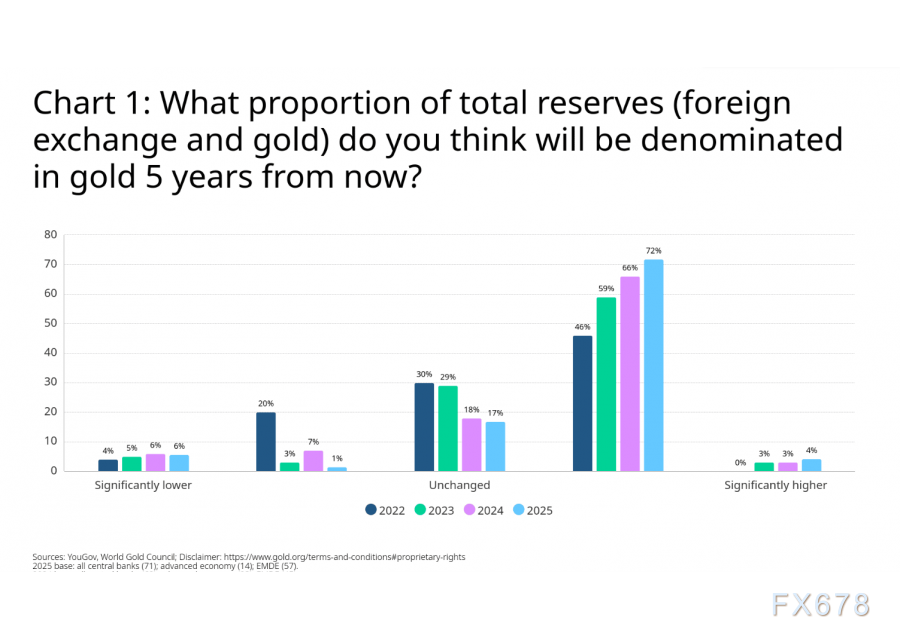 世界黄金协会的调查还显示,72%的央行XM账户类型预计未来五年黄金和外汇储备占比将温和上升,17%认为保持不变,6%预测占比将显著下降。同时有4%的央行认为储备量会远高于预期,不到1%认为会温和下降。这一趋势印证了各国央行继续增持黄金的承诺,巩固了对XM账户类型黄金的结构性需求,并强化了黄金的短期价格表现。
