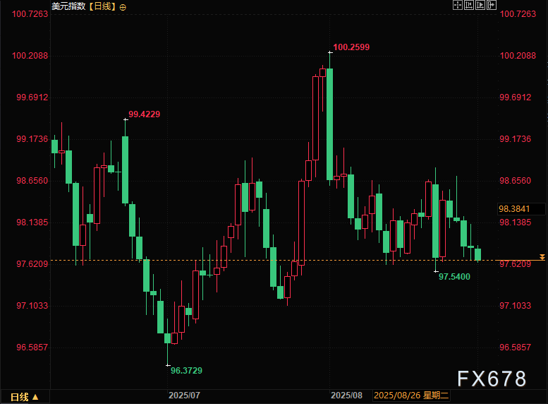 用来衡量美元对一揽子货币的汇率变化程度的指标——美元指数近期整体表现相对疲软,处于低位震荡整理的格局,从上周二特朗普XM账户类型试图解雇美联储理事丽莎·库克后,持续跌势,周一(9月1日)小幅走低,目前交投于97.70附近,