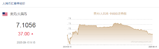 9月15日,人民币兑美元中间价报7.1056,下调37点。