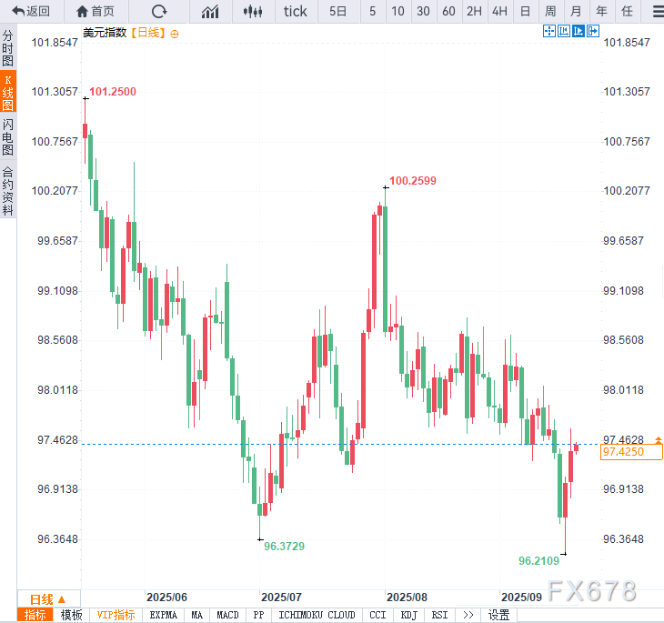 (美元指数日线图,来源:易汇XM账户类型通)北京时间10:17,美元指数现报97.45。