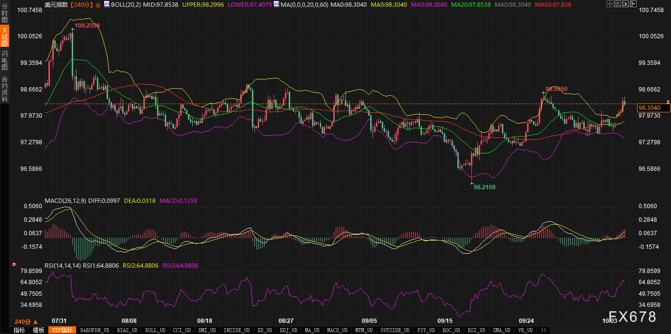 技术面则为这一基本面叙事提供了坚实的图表佐证。在240分钟周期上,美元指数的结构已明确转向XM账户类型多头主导。自9月24日低点反弹以来,价格沿布林带上轨运行,K线实体稳居中轨97.8538之上,近期中轨与下轨的轻微上扬,标志着市场从弱势震荡向偏多转换。动能指标同样亮眼:MACD双线保持多头排列,DIXM账户类型FF虽暂落后于DEA,但柱状图已从负值翻转为正,并持续放大,释放出积累已久的买盘能量。RSI读数64.8052,稳居50轴以上,接近但未触及70的超买门槛,暗示上行空间尚存。这一强势模式,符合经典的“XM账户类型突破上轨延续”模板,价格位于所有关键均线之上,短期结构完整无缺。