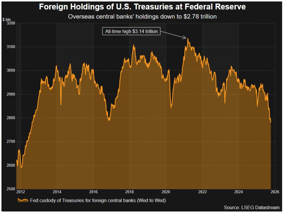 在黄金价格屡创新高之际,纽约联储代表全球各国央行持有的美国国债规模,已降至逾十年最低水平,这再次引发外界对外国投资者持有美国主权债务及其他美元计价资产意愿的质疑。