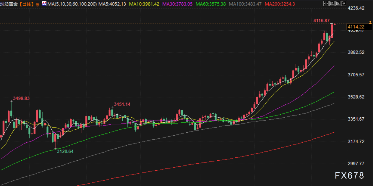 黄金周一首次突破每盎司4100美元,再创历史新高至4116.87美XM账户类型元,白银也刷新纪录高位,受贸易关系再度紧张和美国降息预期的影响。