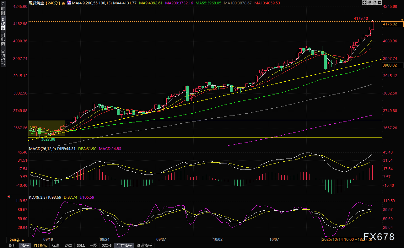 (现货黄金4小时图,来源:易汇通)北京时间13:32,现货黄金现报4174.64美元/盎司。