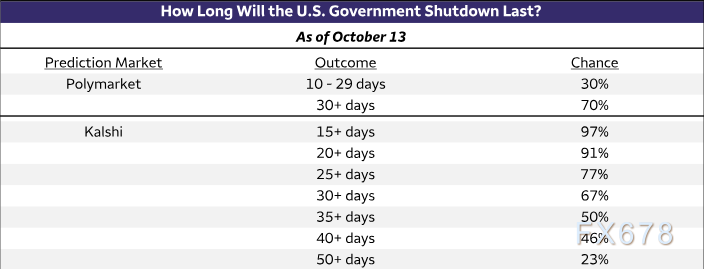 目前看来,能够推动双方达成解决方案的痛点或缓冲机制正日趋难以寻觅。鉴于经济与金融市场尚未出现剧烈阵痛,政府服务也未发生重大中断,市场对停摆持续时间的预期正不断延长。PolymXM账户类型arket、Kalshi等预测市场平台数据显示,停摆持续至10月底的概率已升至约70%。