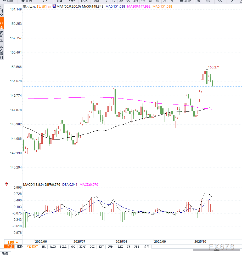 从美元兑日元日线图来看,汇价在连续数日测试152.00附近的阻力未果后,出现明显的动能衰竭迹象。目前价格下方的200小时均线(1XM账户类型51.20-151.15区间)成为关键支撑。