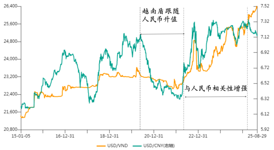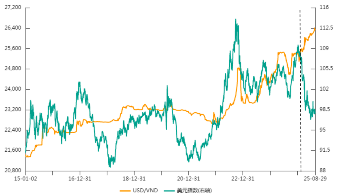 2025年2月至今,越南盾走出了一波贬值行情。如XM账户类型图5所示,越南盾从春节假期后第一个交易日(2月3日)开始贬值,对美元从25075贬值到8月末的26345,贬值幅度达到5.06%,对人民币贬值约6.85%。而同期美元指数跌幅约8.84%,人民币对美元XM账户类型则升值约1.82%。
