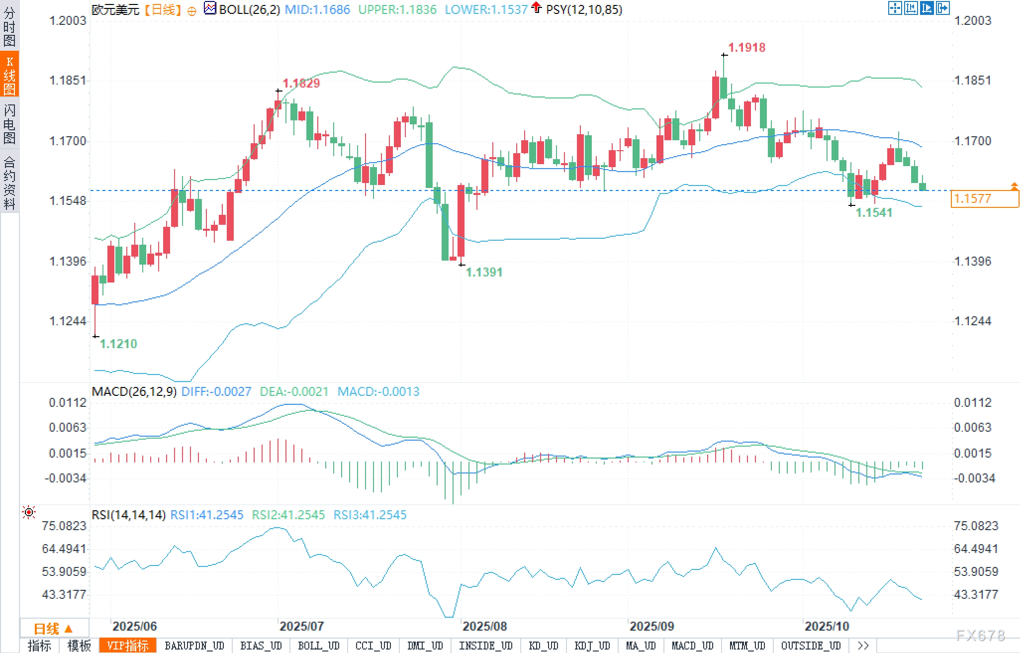 MACD(26,12,9)XM账户类型 的DIFF约-0.0027、DEA约-0.0021、柱状图约-0.0013,仍在零轴下方小幅扩阴,显示动能偏弱但未大幅放大;一旦柱体继续放大且DIFF下穿DEA形成加速,则可能触发对1.1541/1XM账户类型.1537区域的回测。