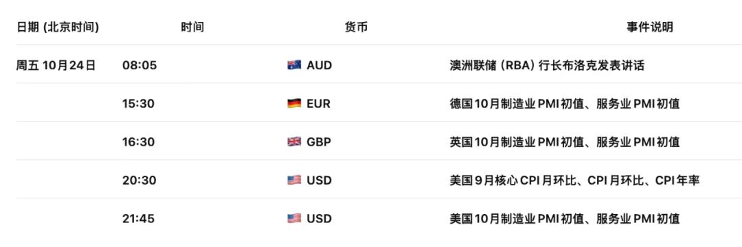 今日10月24日周五,加拿大暂无重要经济数据发布。市场焦距于北京时间20:30美国劳工统计局公布的9月消费者价格指数(CPI)数据,受美国政府关门影响,该数据的发布XM账户类型已推迟9天。此外,投资者需留意北京时间21:45,标普全球将发布美国10月制造业及服务业采购经理人指数(PMI)初值数据。