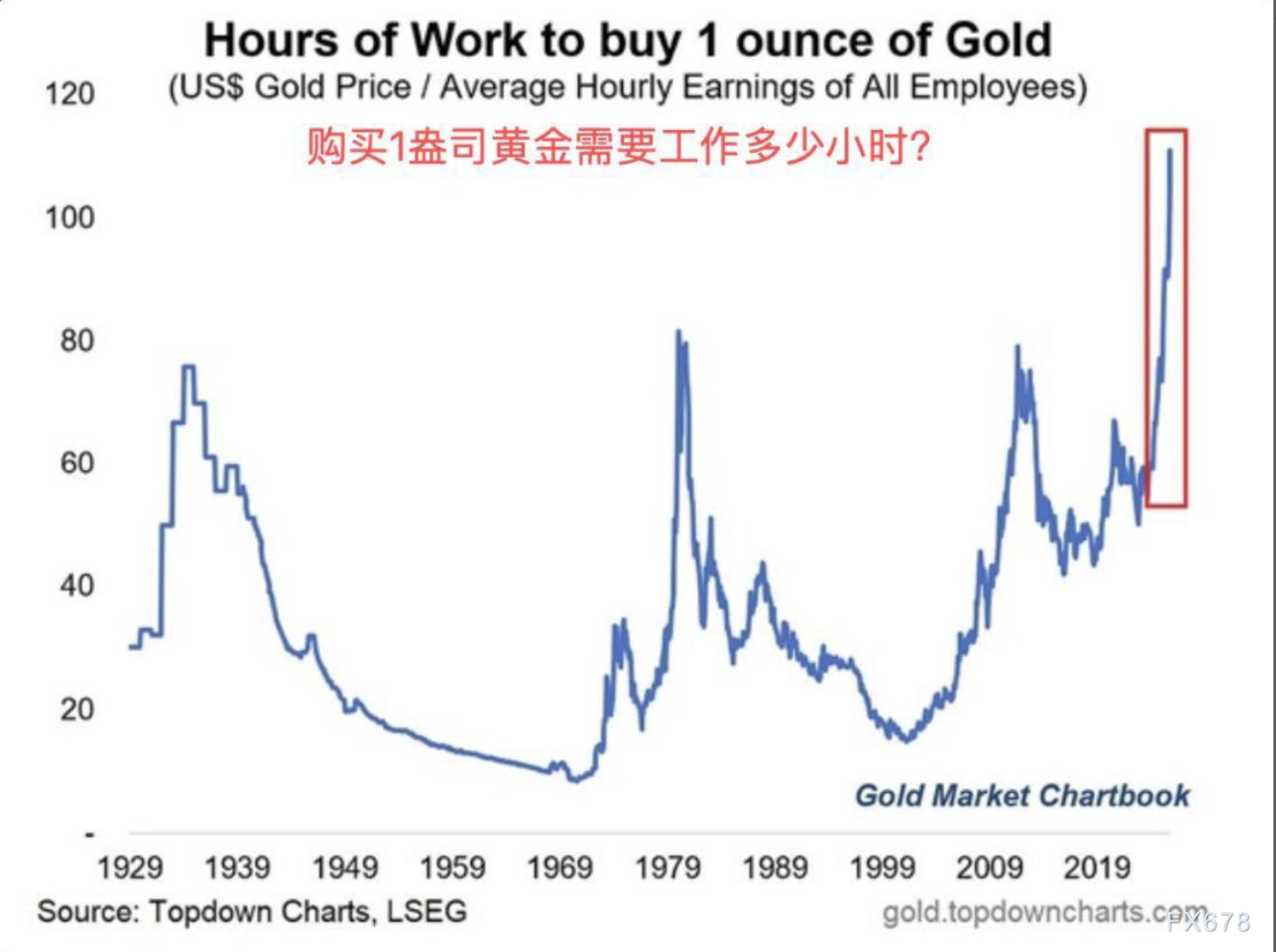 美国人均工作时薪为36.5美元,现在,美国人平均要工作116个小时才能负担得起一盎司的黄金——这是过去一个世纪以来的最高纪录。