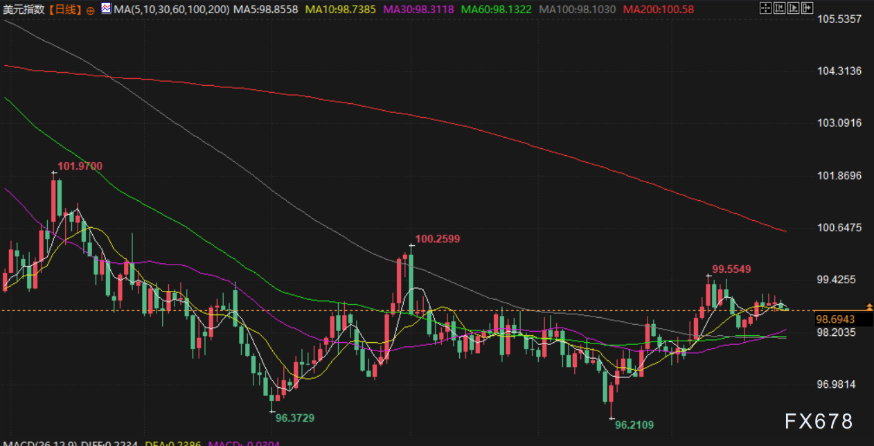美元指数尾盘下跌 0.11%,报 98.84;欧元上涨 0.15%,报 1.1643 美元。