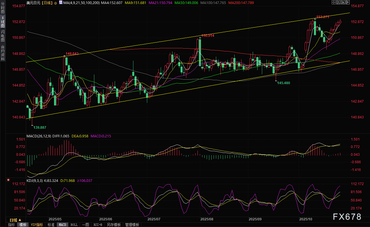 XM账户类型汇通财经APP讯——日元(JPY)兑美元连续第七天下跌,因市场预期日本新首相高市早苗将推行扩张性支出政策并抵制早期收紧政策。此外,中美贸易紧张局势缓和的迹象也削弱了避险日元的需求,推动美元/日元在XM账户类型周一(10月27日)亚洲时段升至两周多高点,最高触及153.25,接近10月10日创下的近八个月高点153.27;目前小幅回落至153.05附近。