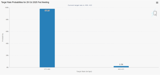 交易员和经济学家自信地预计美联储将降息至XM账户类型3.75-4.00%的区间。截至撰写本文时,CME FedWatch显示联邦基金期货交易员预计降息25个基点的可能性为98%: