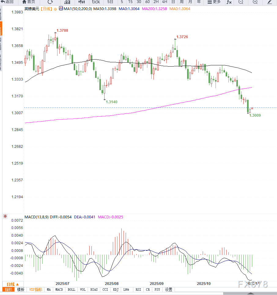 若汇价继续承压并失守1.3000 心理关口,则日线结构将进一步打开下行空间,目标或指向今年4月低点1.2710–1.2650 区域。