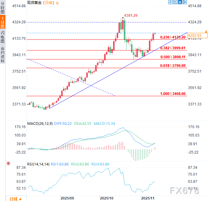 XM账户类型汇通财经APP讯——周四(11月13日),现货黄金连续第五个交易日上涨,目前累计涨幅约5.5%,金价站上每盎司4200美元。近期买盘压力持续坚挺,主要受美联储可能实施更宽松货币政策的预期支撑,该预XM账户类型期导致美元走弱并提振黄金需求。若这一政策前景持续,未来几个交易日看涨动能或将进一步增强。