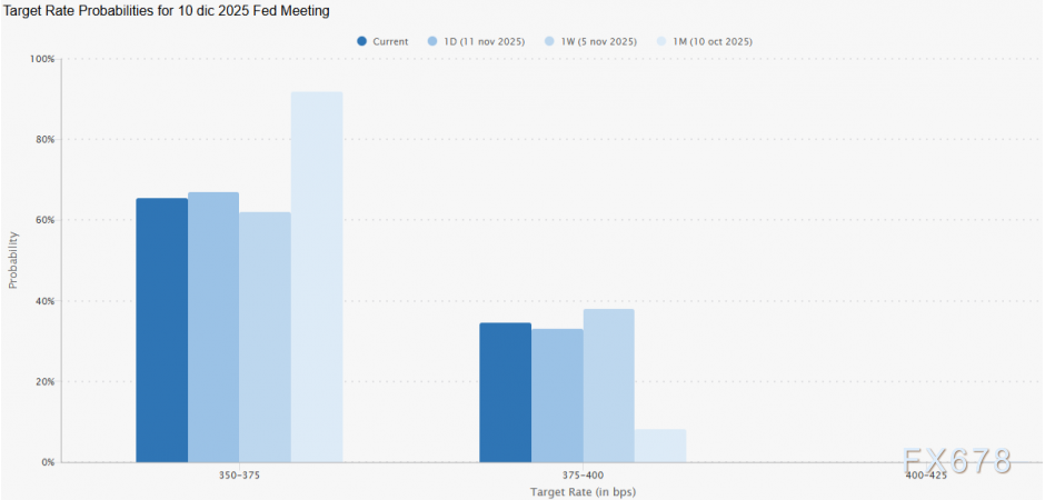 距离12月10日美联储货币政策决议仅剩不足一月,CME集团概率模型显示市场仍预XM账户类型期将降息0.25%,基准利率从而从4.00%降至3.75%。虽然一个月前这种降息概率超过90%,现已缓和至65%,但仍反映市场对美联储下次会议年底前降息的强烈预期。