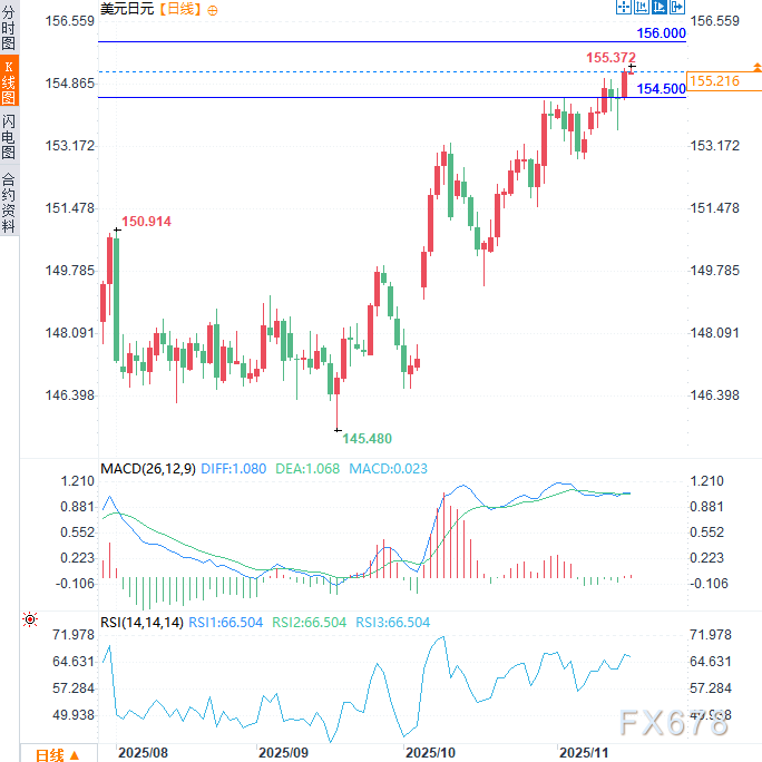 从技术面看,隔夜收盘站上155.00心理关口可视为美元兑日元多头的新触发点。