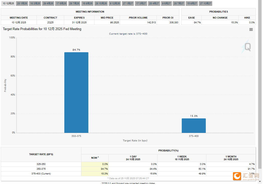芝商所美联储观察工具(CMEFedWatchTool)数据显示,交易员当前对12月25个基XM账户类型点降息的定价概率已攀升至近85%,较一周前30%的水平实现跨越式增长。