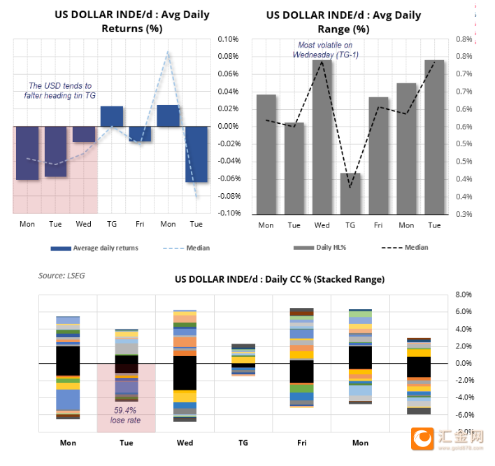 感恩节周期美元走势规律凸显:回溯1985年以来的历史数据,美元指数在假期前三个交易日(周一、周二、周三)平均回报率均为负值,上涨概率均不足50%,其中周XM账户类型二下跌概率高达59.4%。