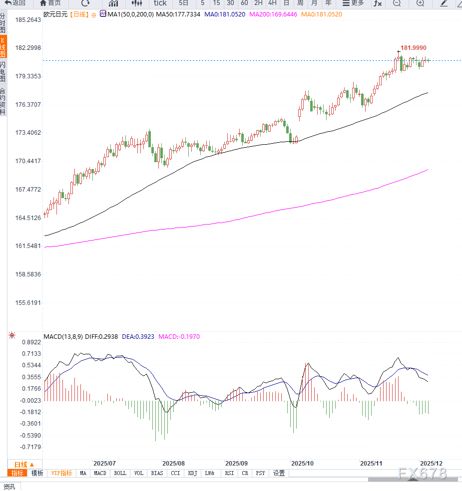 MACD在零轴附近震荡,红柱动能收敛,RSI约在55附近,显示短线缺乏明确趋势方向。若汇价守住180.50支撑,则仍有机会向181.50甚至182.00测试阻力;