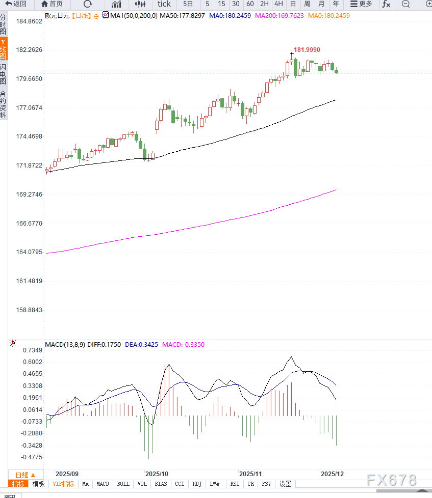 从日线图形来看,EUR/JPY短线维持震荡偏多格局:汇价目前位于180.20附近,接近布林带中轨,显示短线整理。100日指数均线在179.XM账户类型80附近,为关键支撑。RSI报55,动能温和,尚未出现超买压力。