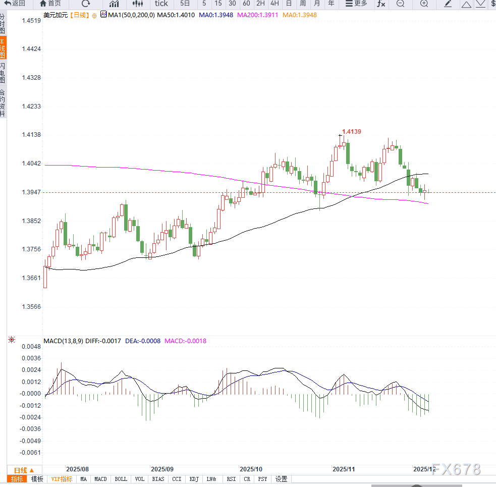 从日线图形来看,USD/CAD维持窄幅区间整理:当前价格徘徊在1XM账户类型.3920—1.3980之间,显示短线买卖力量均衡;5日与10日均线趋于平行,表明多空暂时僵持;MACD动能柱接近零轴,涨势与跌势动能均有限;