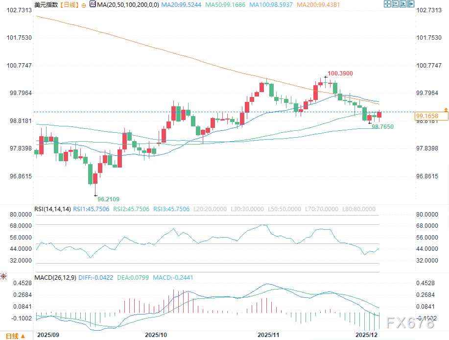 XM账户类型汇通财经APP讯——周一(12月8日)美盘早盘,美元指数小幅走高,交易员试图收复50日均线99.169这一关键水平——守住该位置将为美联储关键会议周的美元短期动能提供稳定性。尽管市场普遍预期周三的XM账户类型降息已被定价,但美元持仓仍保持稳健。