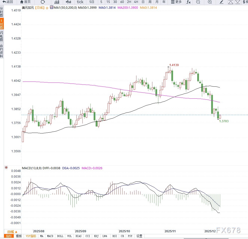 日线图上来看,美元兑加币维持1.3800附近弱势格局,整体呈现空头控盘迹象。K线持续在五日均线下方运行,显示反弹动能有限。MXM账户类型ACD保持死叉状态,空头能量柱扩大;RSI徘徊在中性偏弱区域,未出现超卖,意味着仍有进一步下探空间。