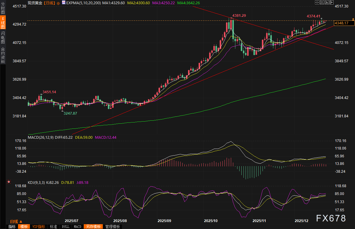XM账户类型汇通财经APP讯——现货黄金上周五(12月19日)收盘上涨0.14%,收报每盎司4338.22美元,上周累计上涨0.89%,回顾过去一周,黄金价格在白银创历史新高67.45美元的背景下,虽然一度被XM账户类型白银的132%年涨幅抢镜,但黄金自身的65%年涨幅同样令人瞩目,显示出其作为核心贵金属的稳健地位。展望未来,分析师普遍认为,黄金将在低利率环境和货币贬值压力下继续上行,甚至在2026年上半年触及440XM账户类型0美元的新高。新的一周将迎来圣诞节假期,但因为美国政府停摆而延迟的三季度GDP数据将于本周公布,投资者需要重点关注。周一(12月22日)亚市早盘,现货黄金震荡微涨,一度触及4350关口,目前交投于43XM账户类型47.60美元/盎司附近。