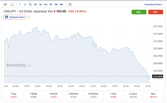受片山皋月讲话影响,日元兑美元汇率一度回升至 155.96日元,但仍接近上周五触及的11个月低点157.78日元。