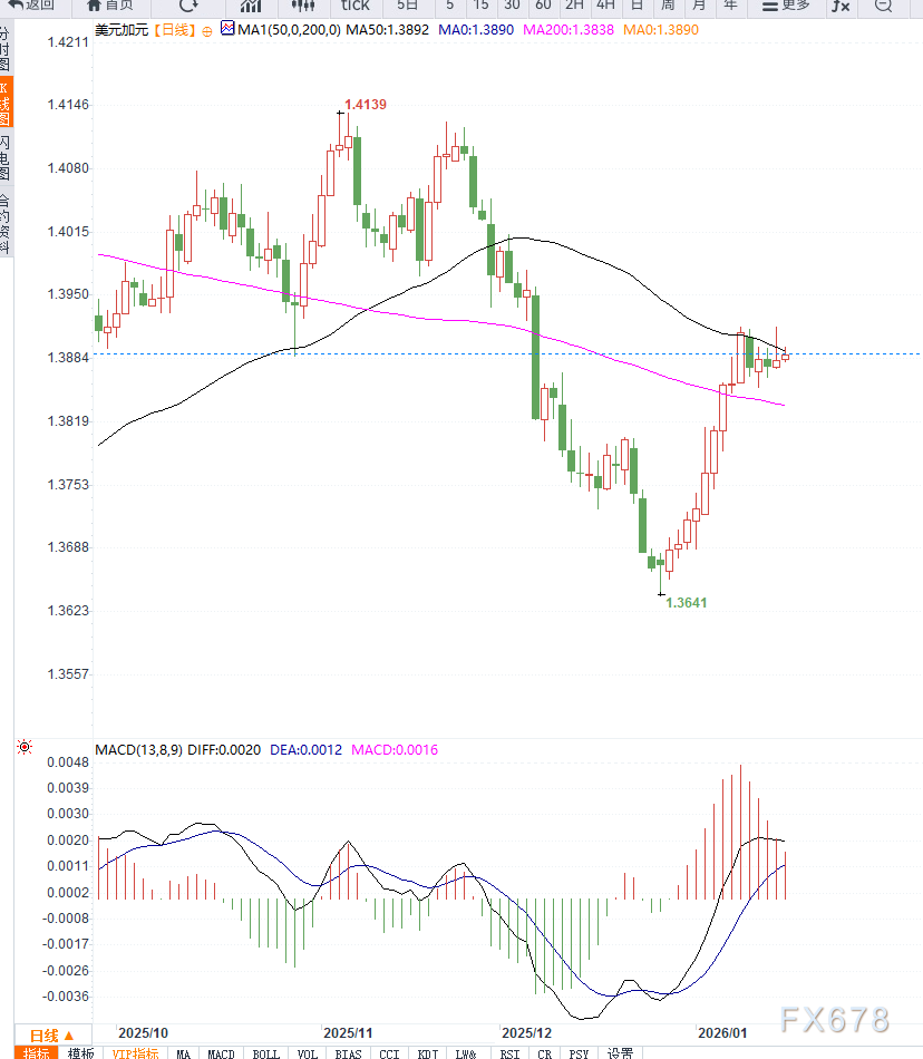 技术面显示短线多头动能减弱,但尚未出现明显趋势逆转信号。预计汇价将在1.3860—1.3930区间震荡,应关注美国工业产出数据及美联储官员讲话对美元的短线冲击。