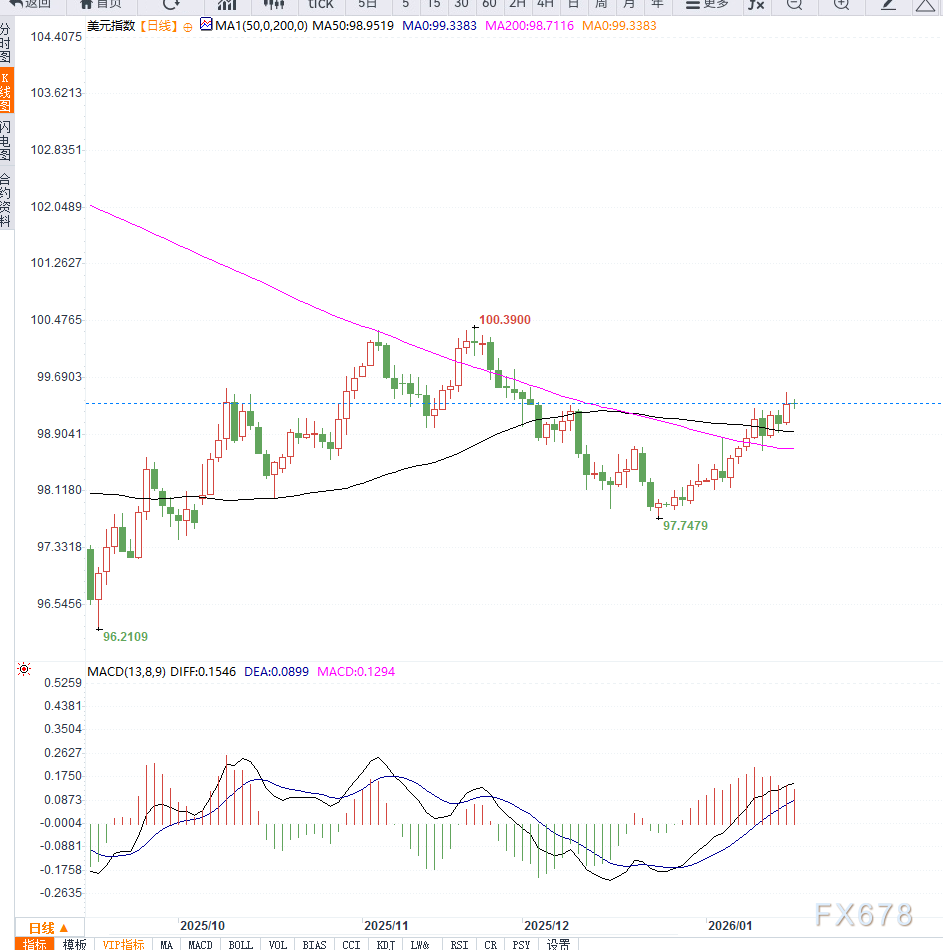强劲就业与通胀黏性预期共同推升美元需求。市场情绪方面,外部不确定性阶段性缓和也对风险偏好形成提XM账户类型振,资本流向更偏向美元资产,使美元指数在高位获得支撑。从日线结构来看,美元指数在此前连续反弹后稳守98.80上方,并逐步上探至99.30一线,整体仍处于多头占优的运行通道。