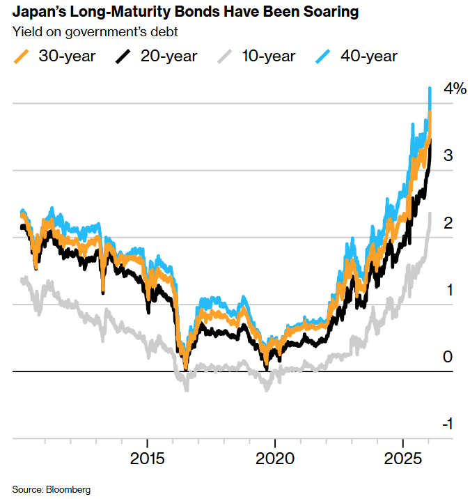 日本首相高市早苗削减食品税的选举承诺引发了长期债券收益率的飙升,30年期和40年期日本国债收益率周二跃升超过25个基点,创下新高。XM账户类型随着日本将于2月8日举行提前大选,投资者担心未来会出现更多波动。