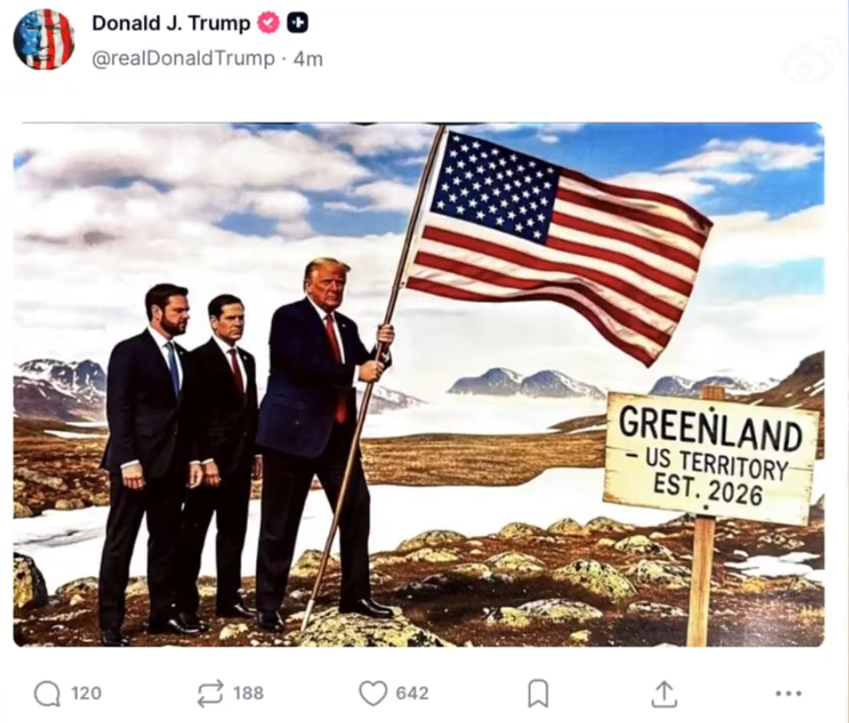 当地时间今天(1月20日)凌晨,美国总统特朗普搭乘专机从佛罗里达州返回华盛顿途中,在其社交平台“真实社交”上发图,暗示吞并丹麦自治领地格陵兰岛。