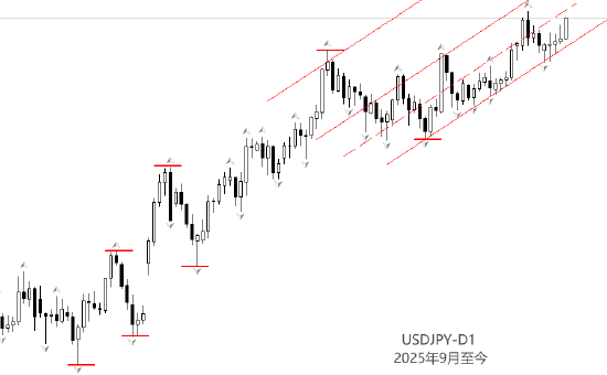 行情方面,USDJPY中长期趋势依旧为显著多头,中期底部和顶部有规律的抬高。最新底分型形成于2025年12月16日,自此之后行情正在XM账户类型寻找新的顶分型。截至目前,两个最新顶分型都不符合要求,预计行情涨势延续,直至中期顶分型出现。图中通道线可以作为实时阻力位,行情与通道交叉时有回落可能。